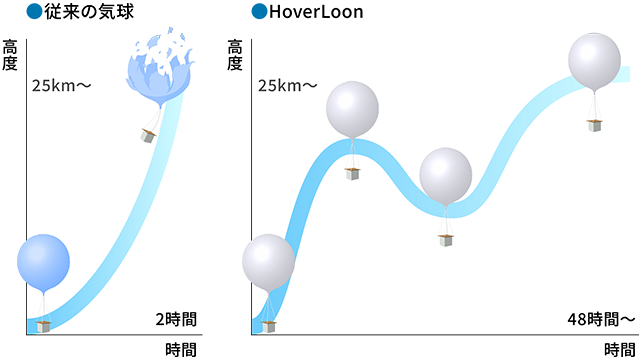 従来の気球が上昇し続けて破裂してしまうのに対し、HoverLoonは成層圏の所定高度に留まることや、特定高度の風を利用した長距離移動が可能です。