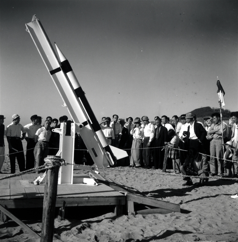 日本初のロケット搭載電子装置としてテレメータ送信装置を開発。FM-FMテレメータを搭載した「ベビーTロケット」の打ち上げが成功し、我が国初のロケット搭載機器のメーカーとなりました。1955年9月17日「ベビーT」1号機の打ち上げに続き、23日までの間に5機の飛翔テストが行われました。